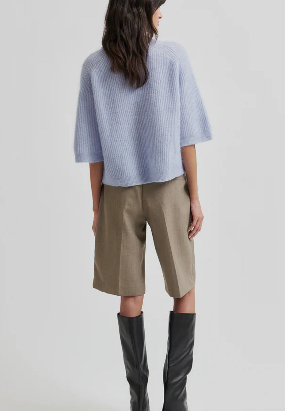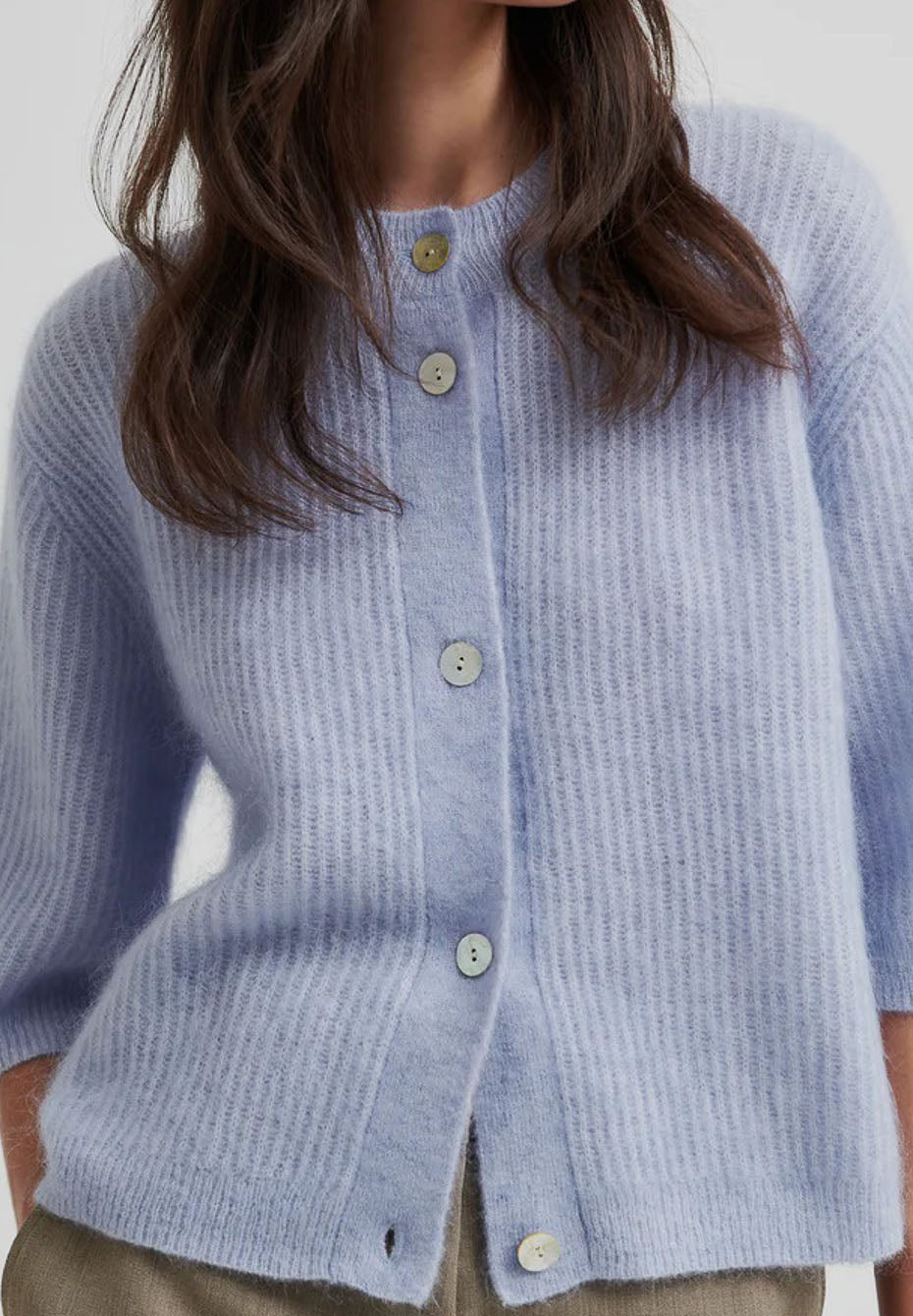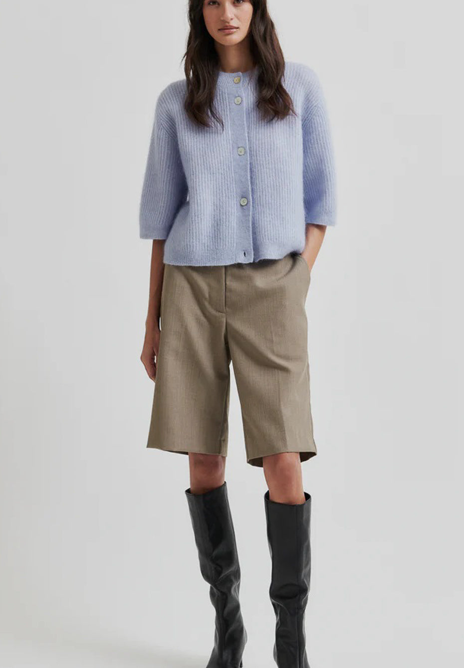 Second Female short-sleeved ribbed cardigan. The cardigan is made in a soft mohair-wool blend with ribbed structure. Featuring a round neck and button-through fastening with mother-of-pearl buttons. Dropped shoulders. Regular, slightly boxy fit.
