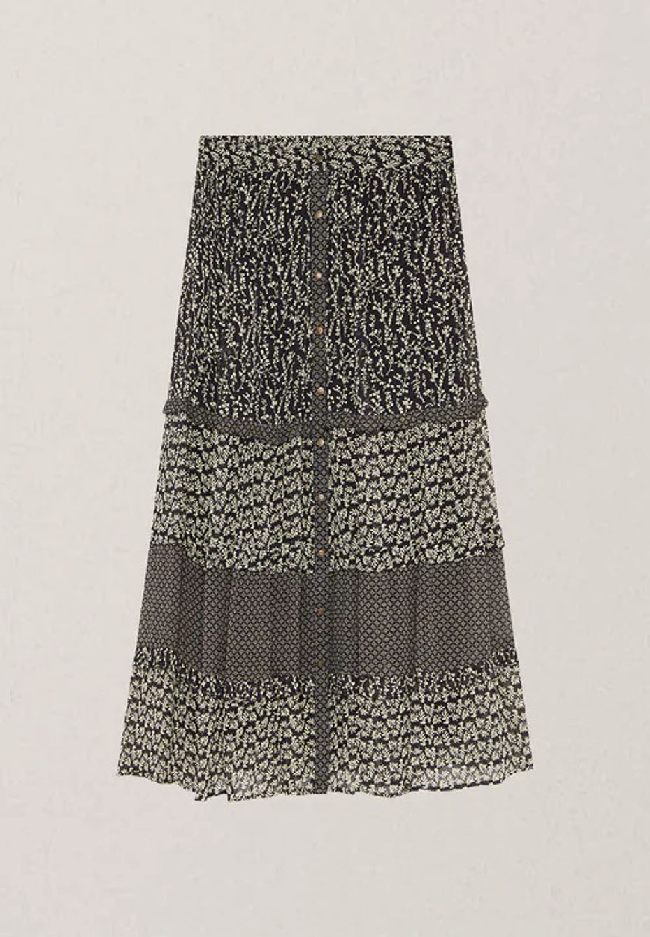 This version comes in airy georgette viscose, dark ground with golden florals, layered tier over tier like a memory retold. The cut is long, fluid, a silhouette that sways but never drifts away.