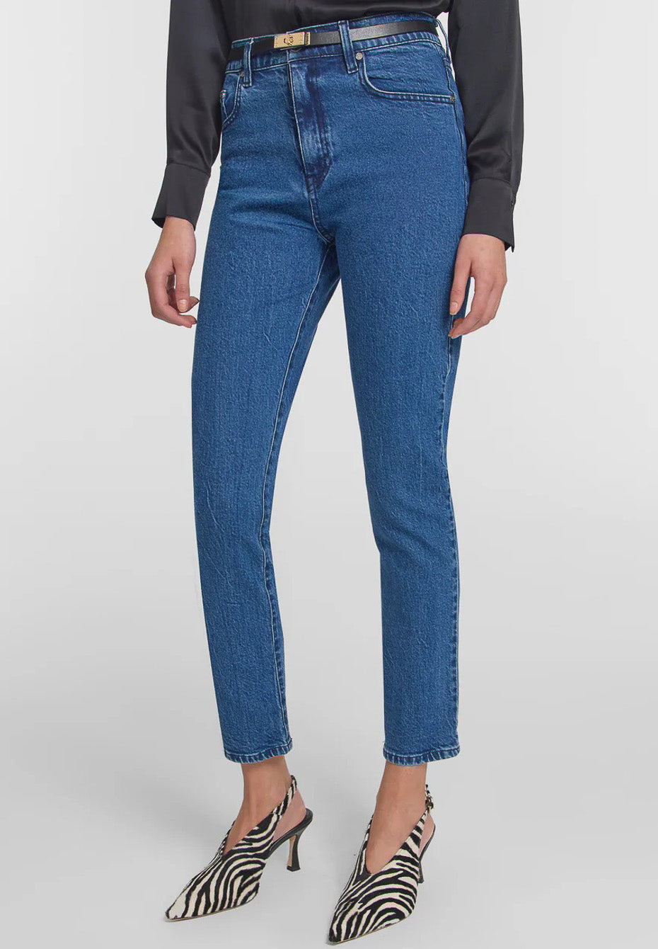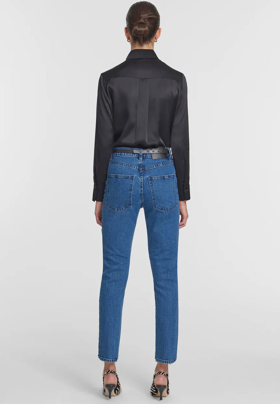 Introducing the Minogue Jean, crafted from classic indigo wash denim with a high-rise, slim-leg silhouette and 3/4 length. Designed with a slight stretch and finished with a signature black logo leather patch and hardware, this clean silhouette is a must-have for effortless, everyday style.