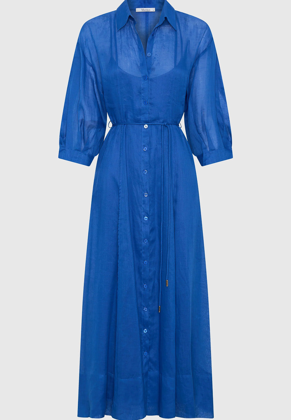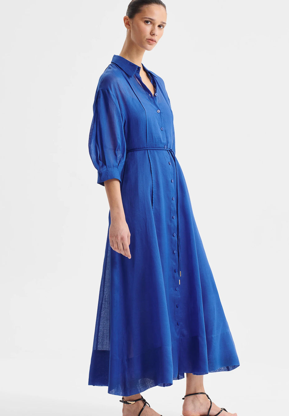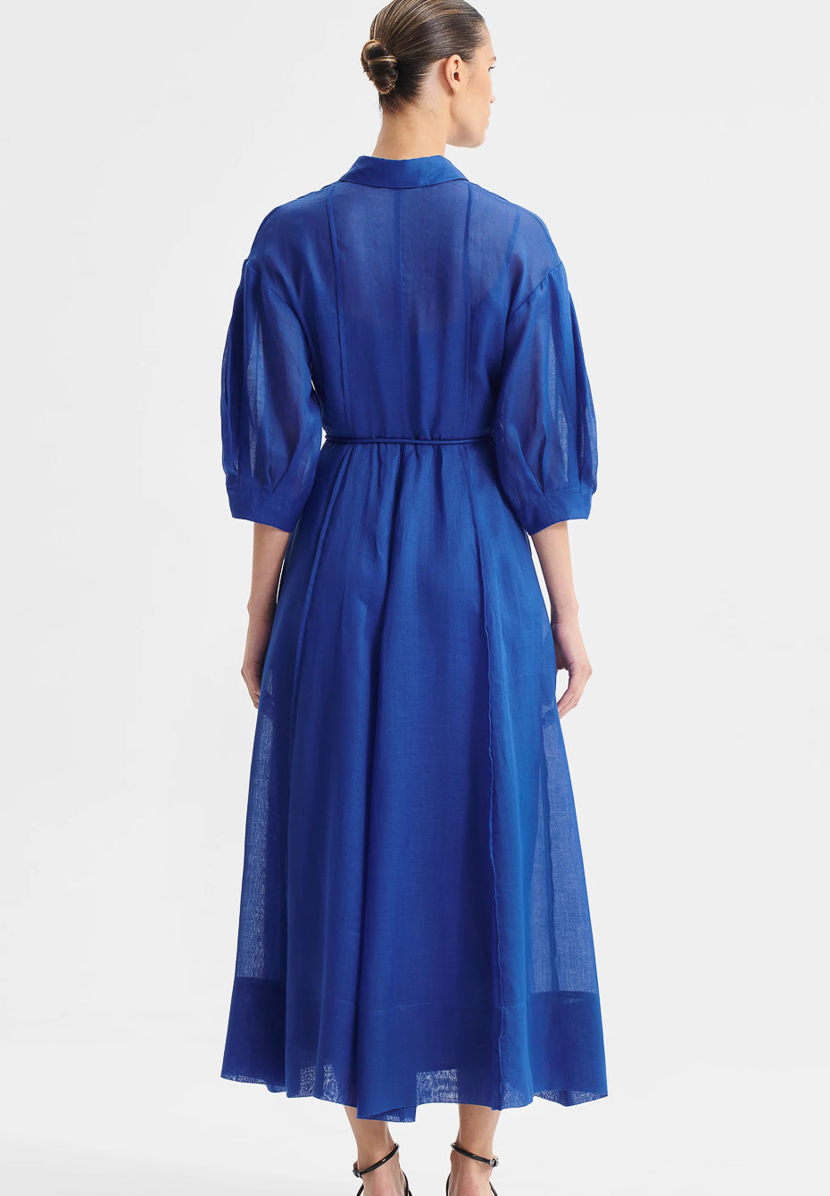 Cut from a lightweight Ramie, the Bonita Shirt Dress combines timeless tailoring with modern ease. Featuring a classic collar, button-down front, and voluminous 3/4 balloon sleeves, this dress drapes beautifully over the body. Pintuck details accent the front and back, creating gentle texture and movement through the swing hem.