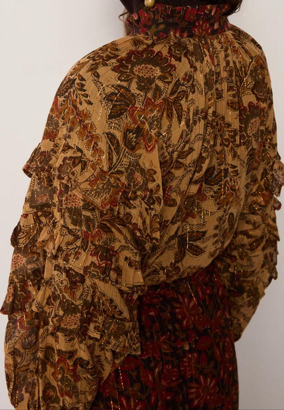 Cut in soft cotton lurex, the Claudine dress carries an earthy print where deep reds and browns fade into an autumnal rhythm. A vintage soul runs through the pattern, with an undercurrent of character.