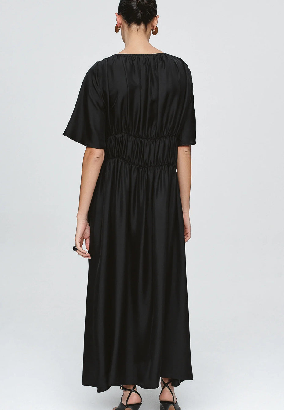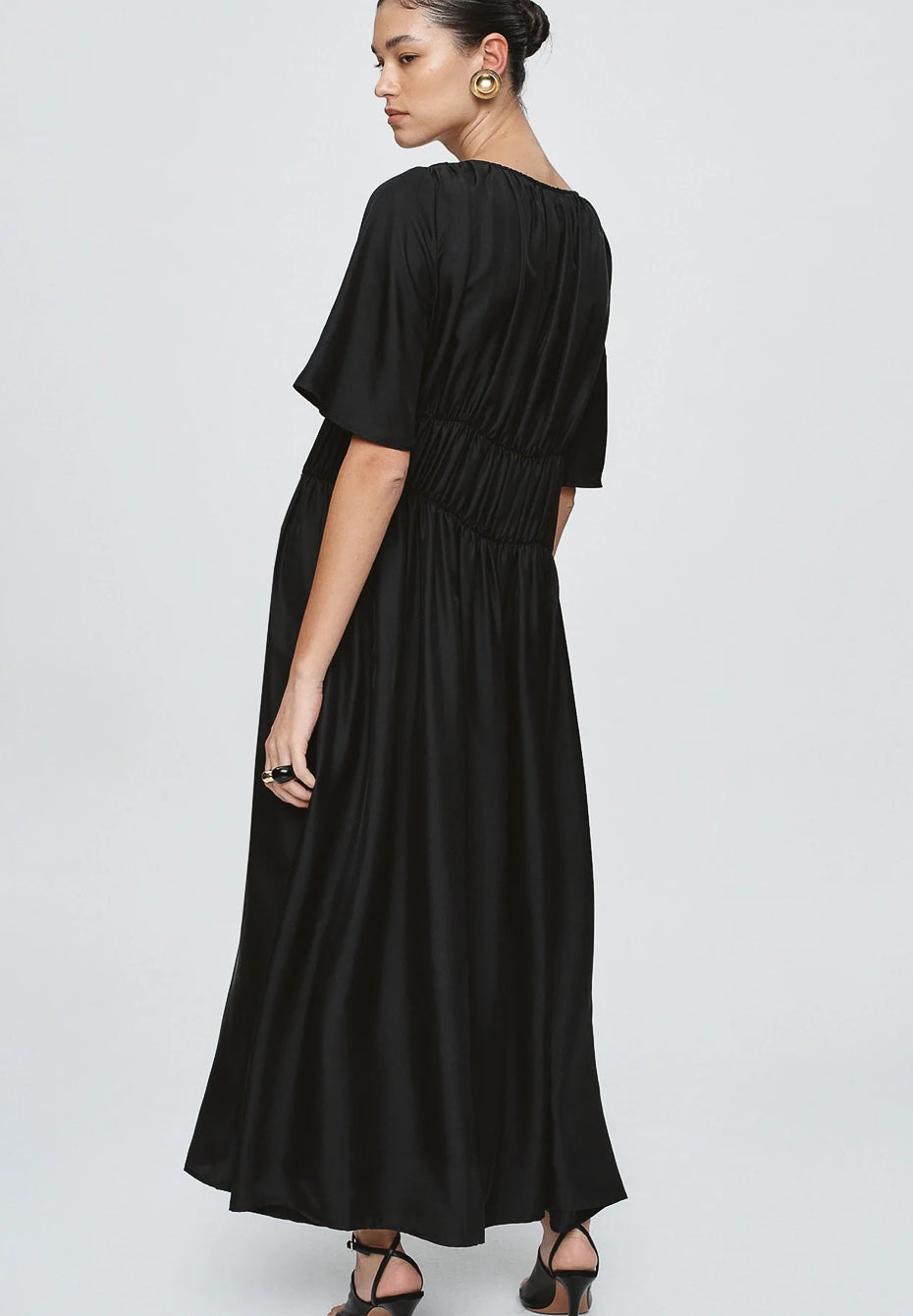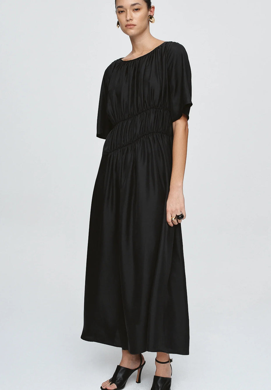 The Dieter Dress is cut from 100% Tencel, offering a soft drape with a subtle sheen. Designed with gathered elasticated channels across the bodice and waist, it creates a softly defined shape while maintaining comfort and ease of movement. The round neckline and wide short sleeves lend a relaxed balance to the sculpted midsection. The full skirt falls to an ankle length.