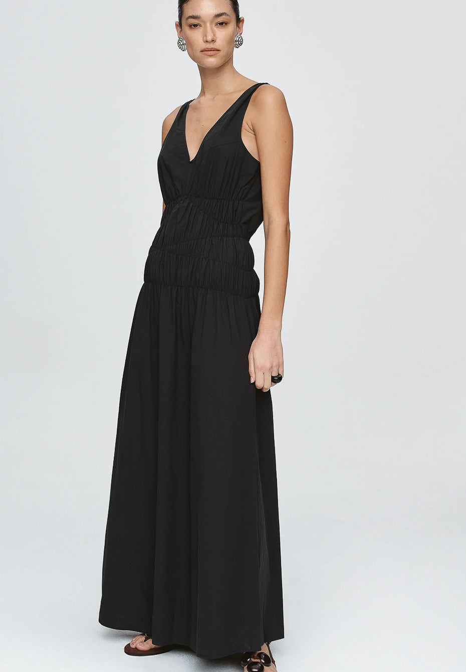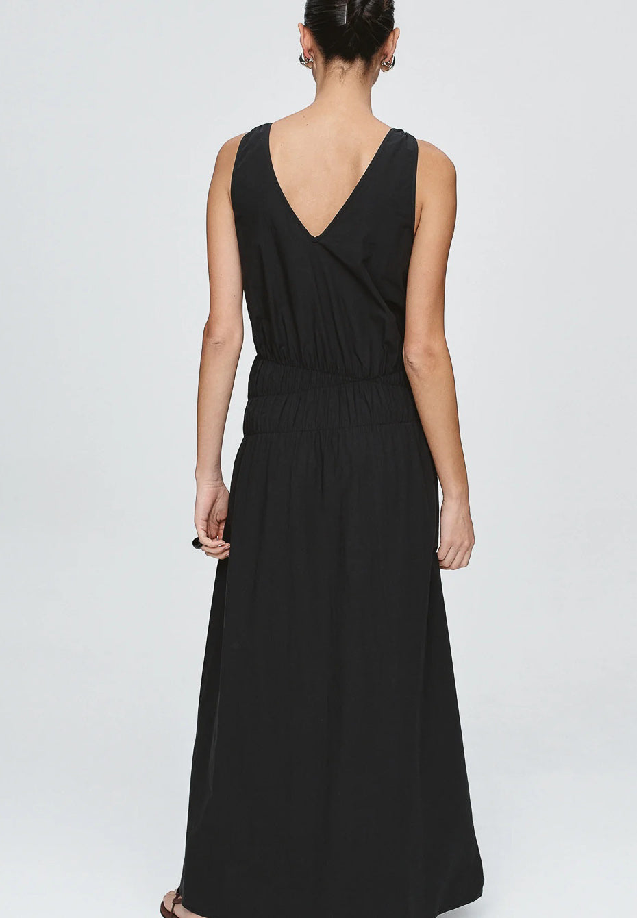 The Lyam Dress is cut from 100% Cotton, offering a crisp yet soft hand feel with a natural drape. Deep V-necklines at the front and back. Gathered elasticated channels contour the bodice and waist, creating soft definition and fluid movement through the full-length skirt.