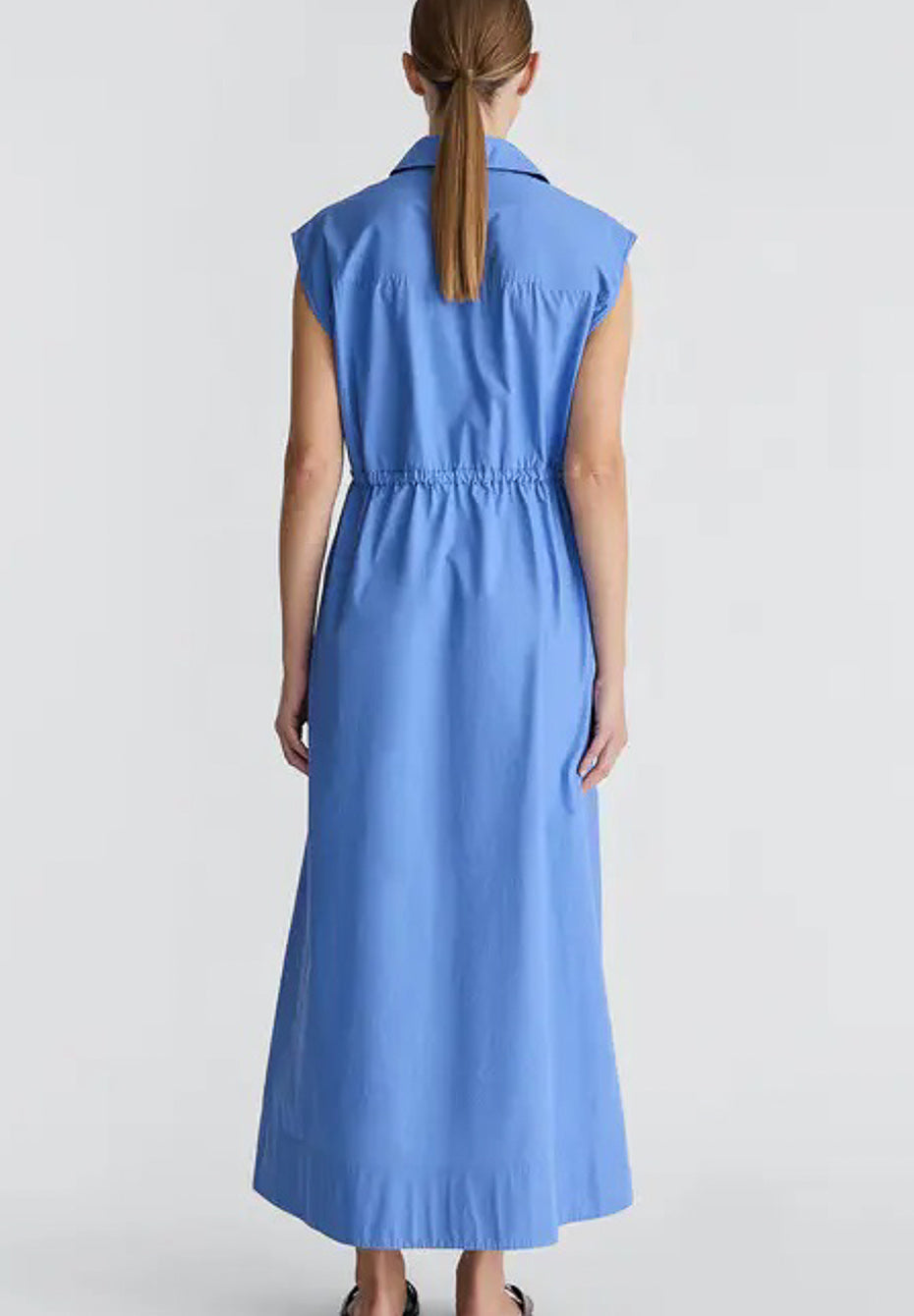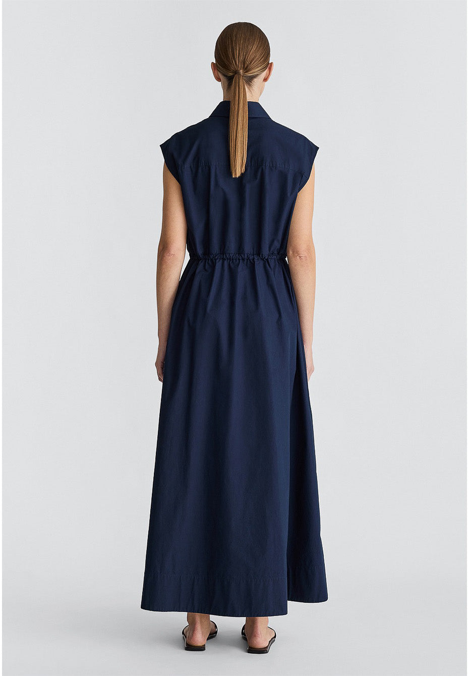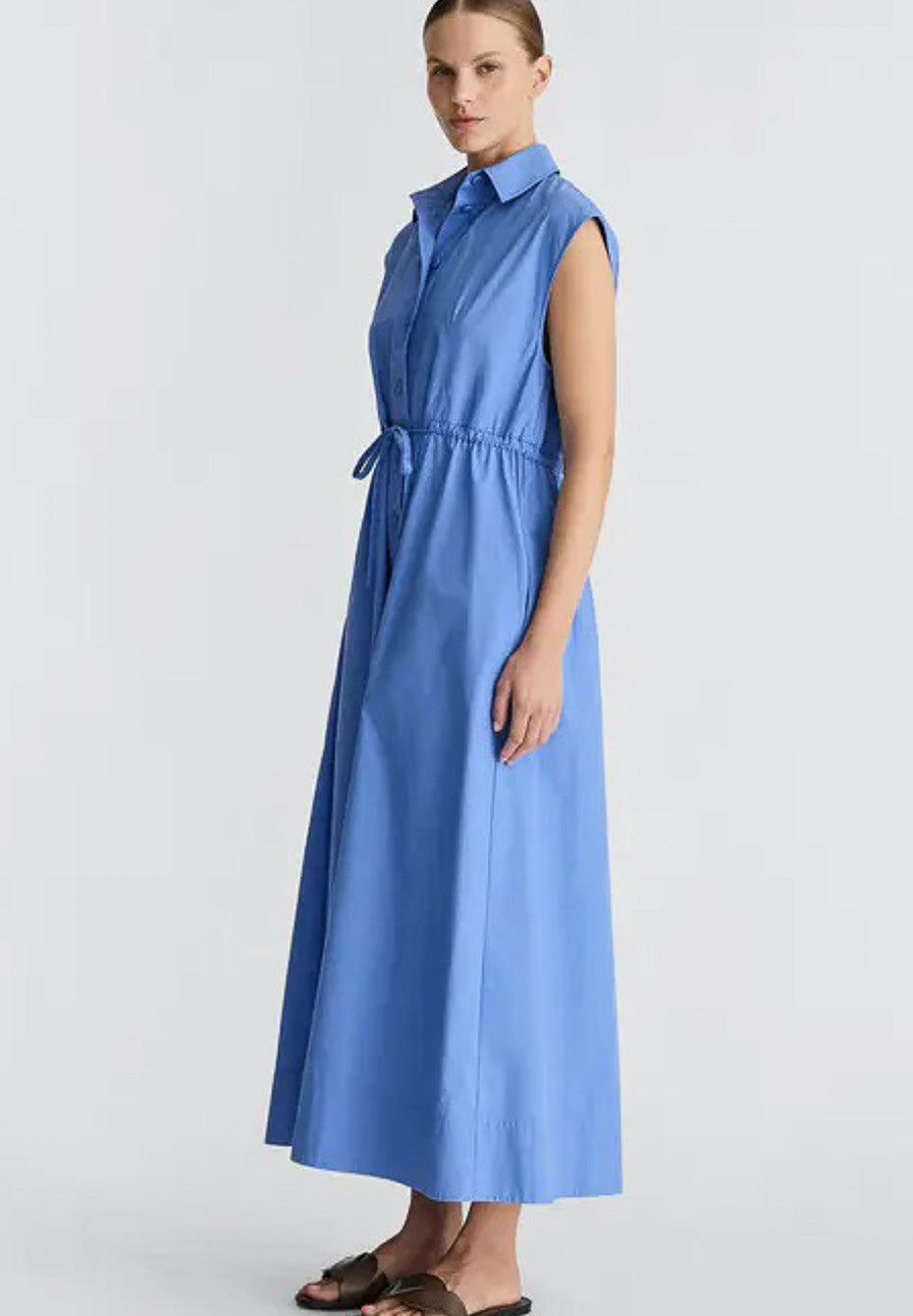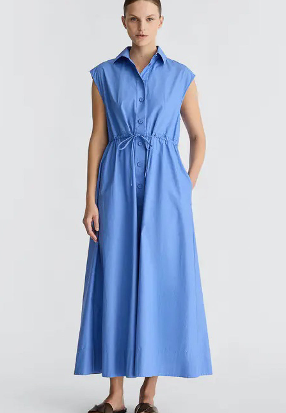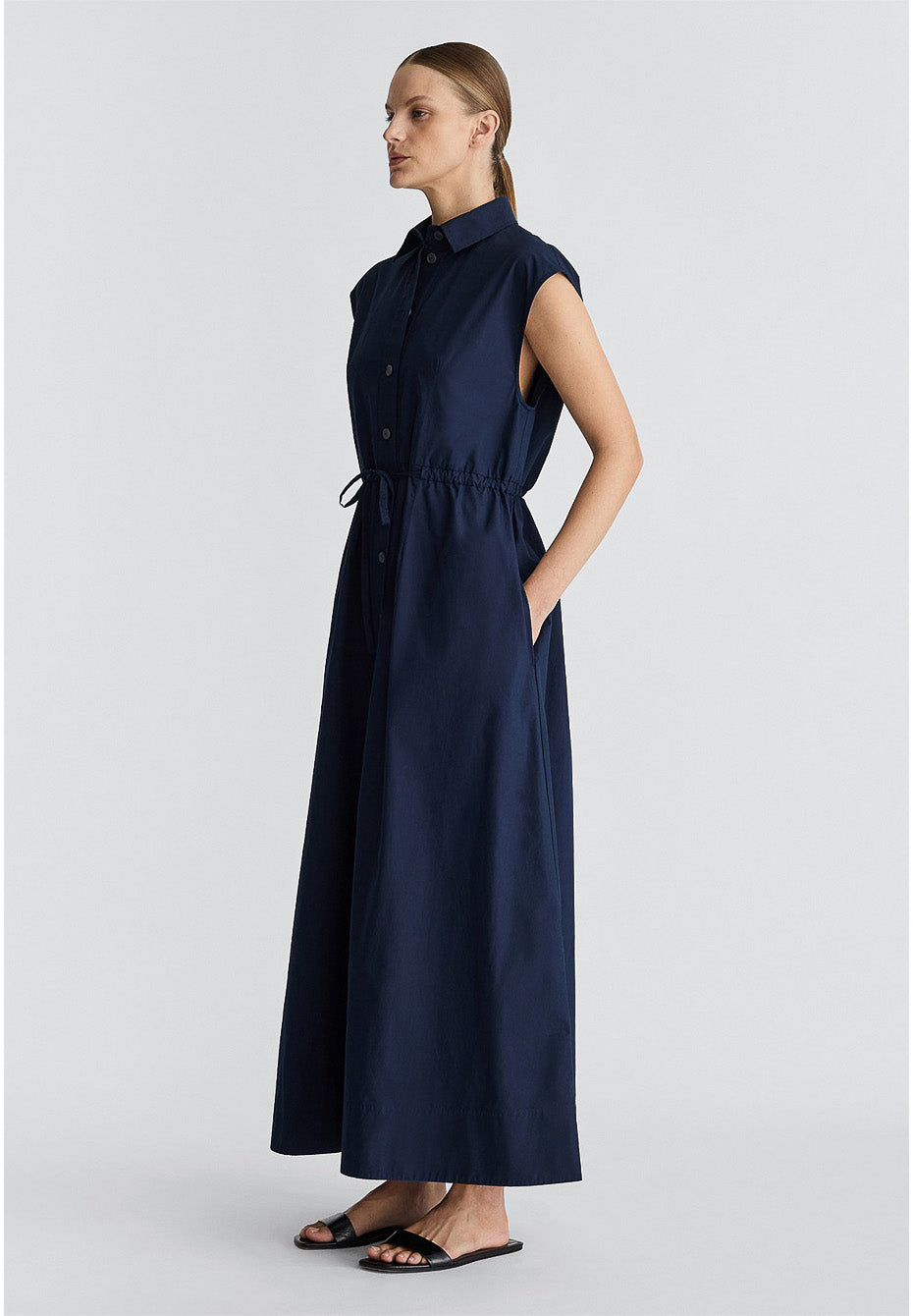 Crisp, clean, and effortlessly put-together. Made from structured cotton poplin, this shirt dress features a flattering extended cap sleeve, feature button closure contrasting with a narrowing drawstring waist for a classic, customizable fit. A modern staple with everyday ease.