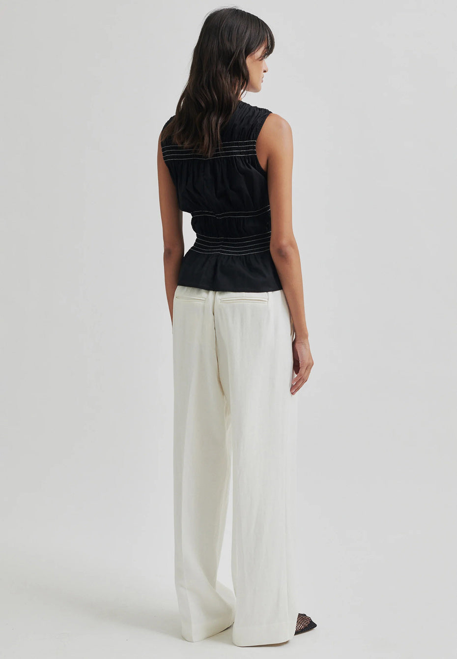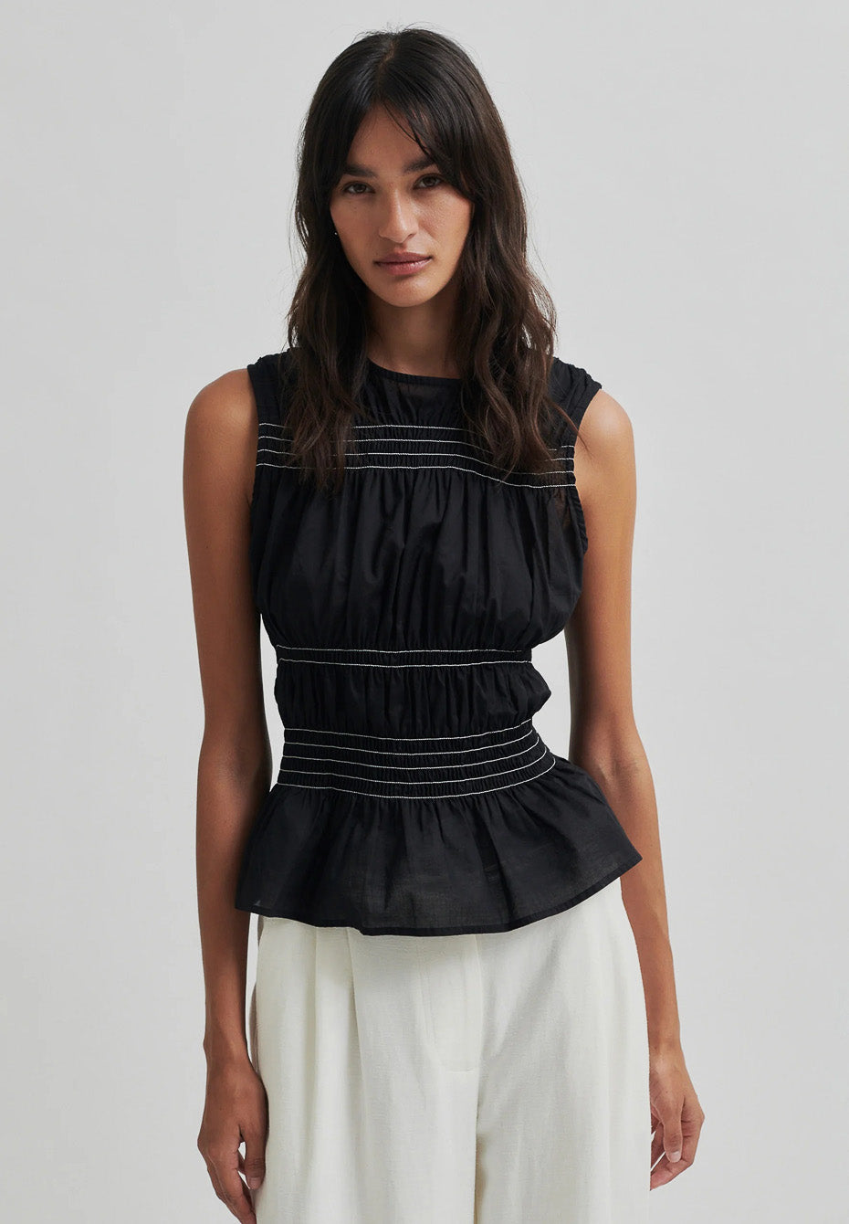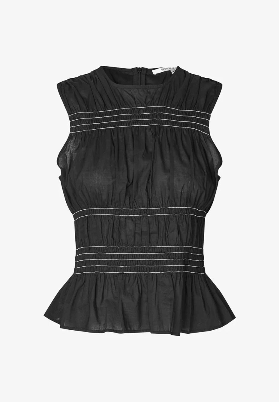 Second Female sleeveless contrast top. The top is made in light organic cotton. Featuring a round neck and concealed zip fastening at the back. Shirred sections at top and waist in contrast colour. Slim fit.