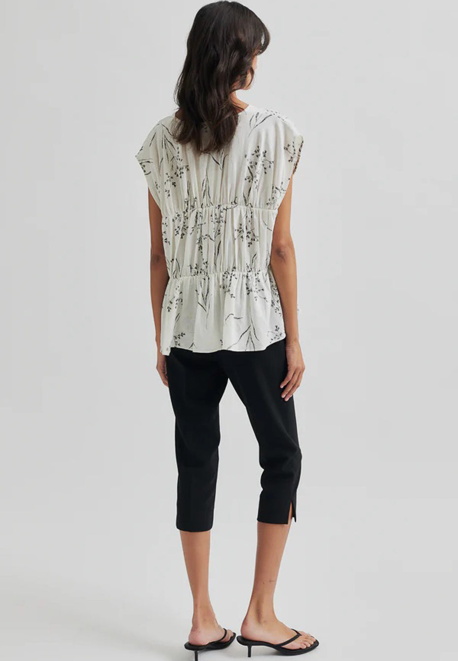 Second Female monochrome gathered top. The top is made in a light linen blend with floral pattern. Featuring a deep V-neck and gathered seams at front and back that create extra volume. Loose and airy fit.