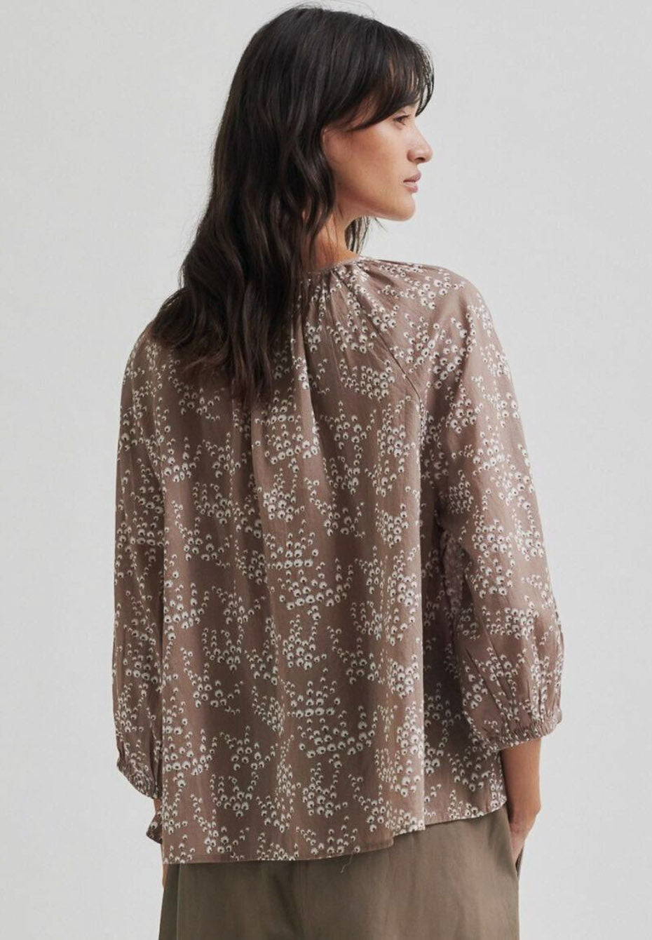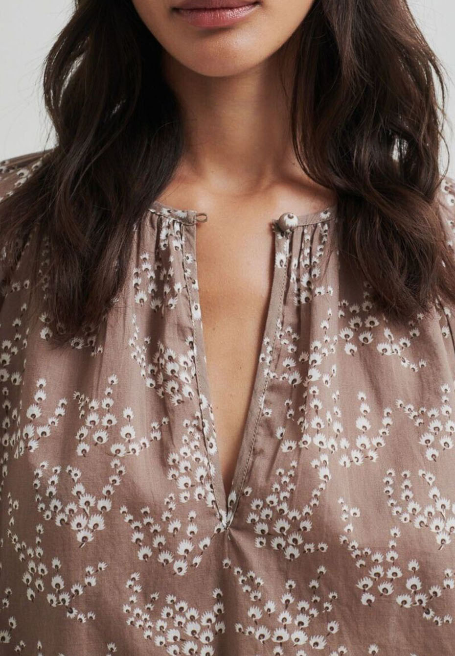 Second Female Sierra Blouse combines a beautiful floral print with a timeless design that is suitable for many different occasions. The cute brown-toned blouse has a slightly boxy design and a slit at the collar that can be closed with a button. The cuffs of the short raglan sleeves are finished with an elastic band.