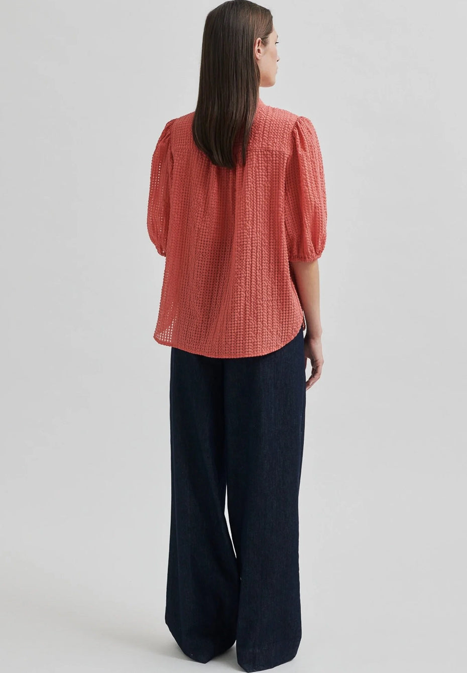 The Tascha Shirt from Second Female in Coral. The perfect spring-fresh blouse in a checkered pattern. Button front, short sleeve with elastic cuff and a slight sheer fabric, the perfect light weight and relaxed top for summer.