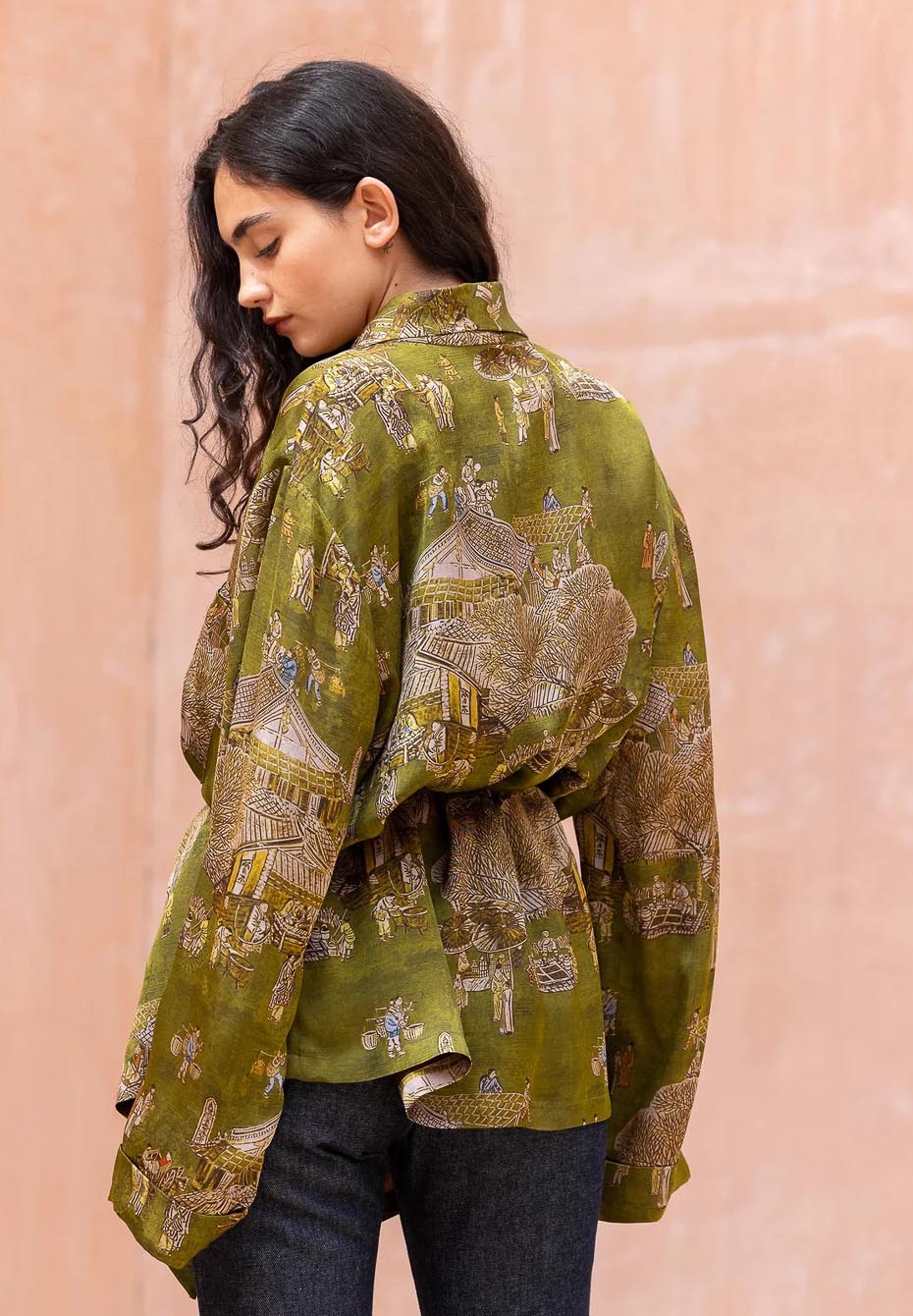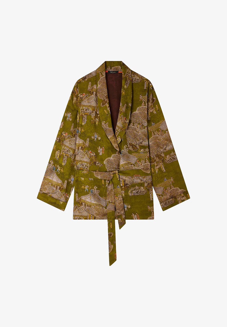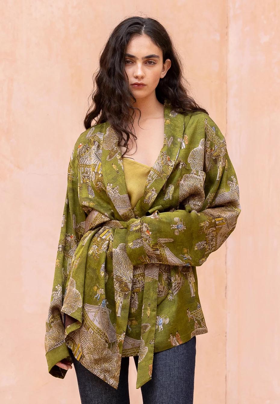 This viscose jacquard kimono is presented on a deep green background, elevated by a refined print playing with contrasts.